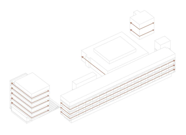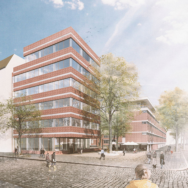 7-geschossiger Stahlbeton-Skelettbau mit unterzugsfreien Stahlbetondecken Ca. 4,50 m Auskragung der 5 Obergeschosse über dem Erdgeschoss Untergeschoss als wasserdichte WU-Konstruktion HDI-Unterfangung des angrenzenden Nachbargebäudes | |