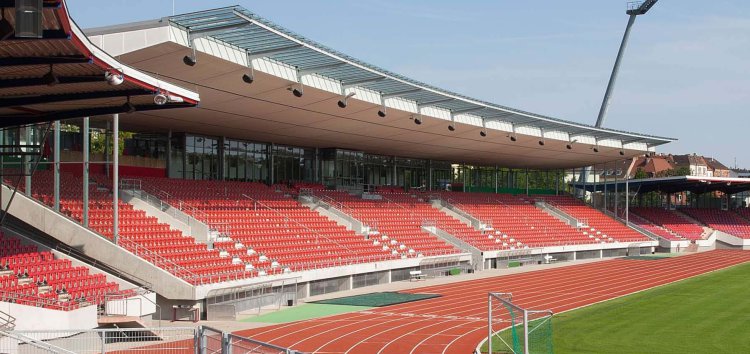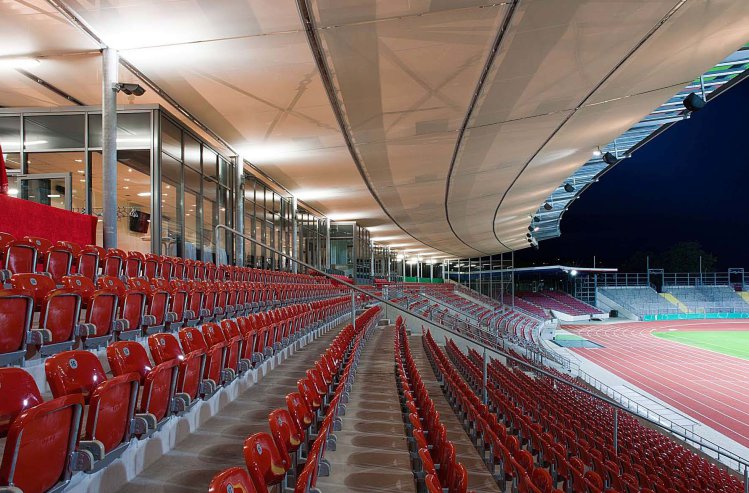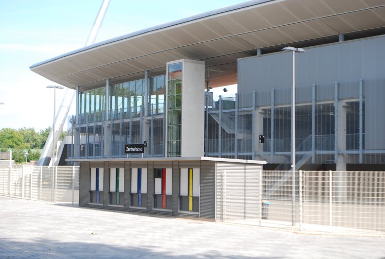 Gesamtgrösse ca. 120 m x 30 m 17 m auskragende räumliche Stahl-Fachwerk-Konstruktion mit unterseitiger illuminierbarer Folienverkleidung VIP-Lounge im 2.OG als Stahl-/Glaskonstruktion 2-geschossiger Stahlbetonbau mit Fertigteil-Zahnbalken und Tribünenstufen-Elementen | |