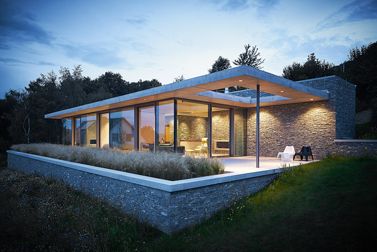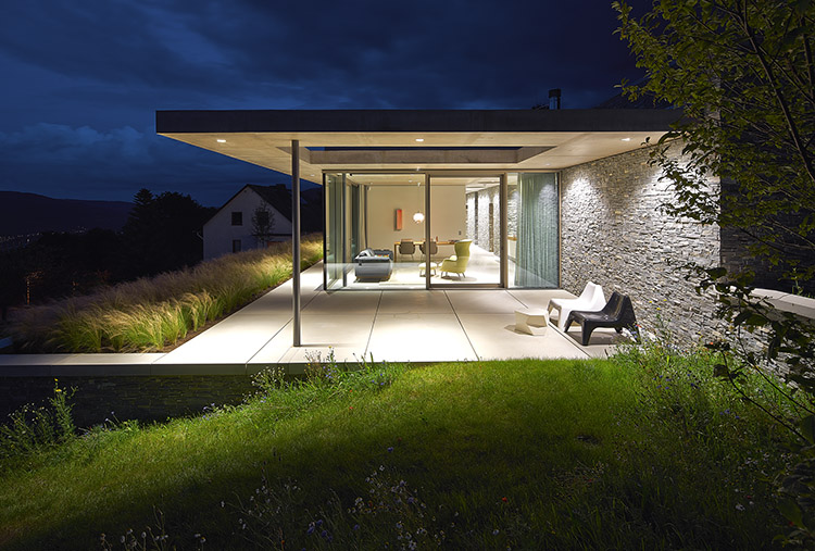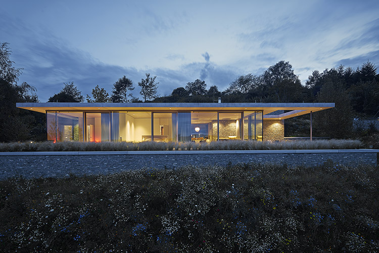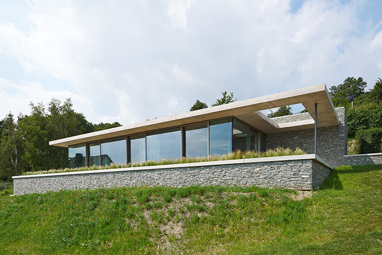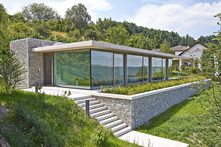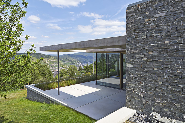 Neubau eines Wohnhauses inmitten des UNESCO-Welterbes Oberes Mittelrheintal in exponierter Hanglage hoch über dem Rhein Eingeschossiger Stahlbeton-Skelettbau in teilweise hochwertigem Sichtbeton Unterzugsfreie Stahlbeton-Flachdecke mit hangseitigem Stahlbeton-Kern und talseitiger Lagerung auf schlanken Stahlstützen |