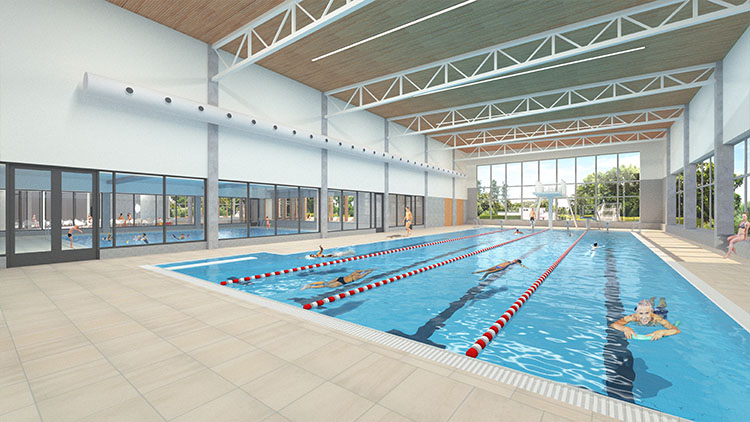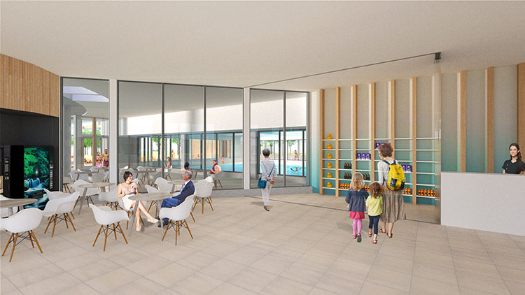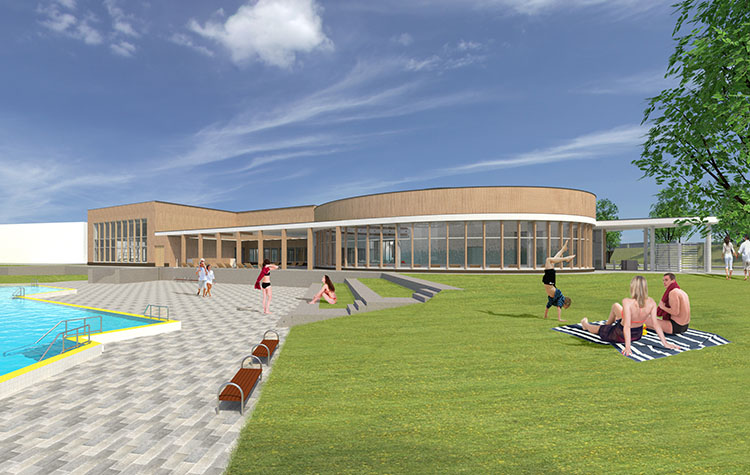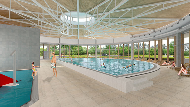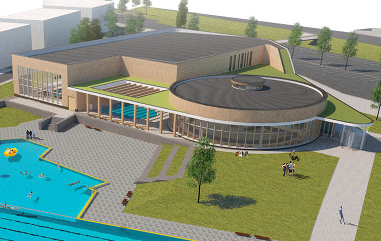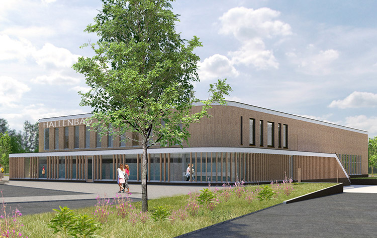 Neubau Hallenbad mit 25 m-Sportbecken, Kursbecken, Vital-warmbecken, Kinderbecken sowie Sole-Außenbecken und Gymnastikraum mit Büro- und Sozialflächen im Obergeschoss Räumliches Stahl-Tragwerk als „Speichenrad“-Konstruktion zur stützenfreien Überdachung des Vitalwarm- und Kinderbeckens Lüftungszentrale im Obergeschoss auf weitgespannter, freitragender Stahlbeton-Konstruktion über dem Kursbecken Untergeschoss mit einbindenden Becken und Schwimmbad-Technik als wasserdichte WU-Konstruktion mit elastisch gebetteter Stahlbeton-Gründungsplatte | |