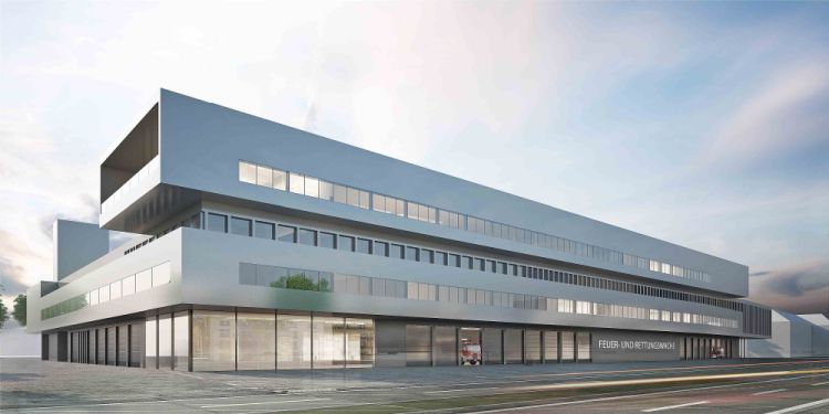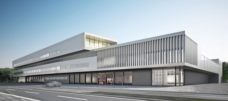 Neubau der Feuer- und Rettungswache mit Sporthalle und Außensportfläche im 2.Obergeschoss Abfangung der 4 aufgehenden Geschosse über der Fahrzeughalle im Nordflügel mit Stb.-Unterzugs-Systemen und Kragscheiben in den oberen Geschossen als räumliches Tragwerk Gründung des hochbelasteten Nord- Riegels mit Groß-Bohrpfählen |