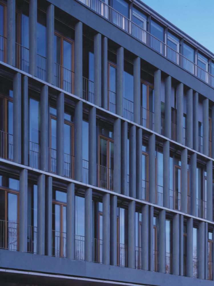 6-geschossiges Gebäude mit Tief- garage in Ortbeton-Skelett-Bauweise Alle Decken unterzugsfrei mit Spannweiten bis 10,50 m Abfangung der Aussenstützen der 4 Obergeschosse mit Ortbeton-Kon- solbalken in Erdgeschossebene |