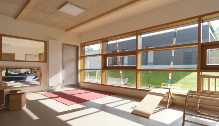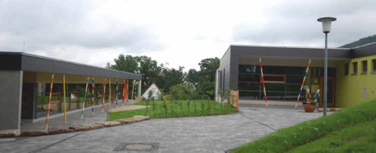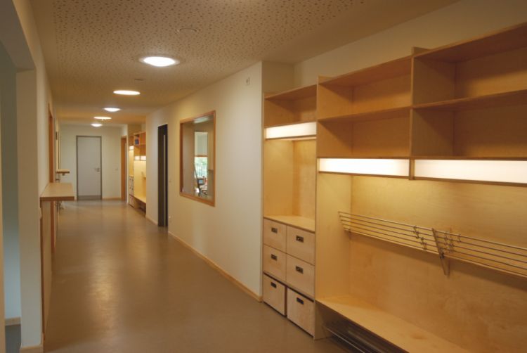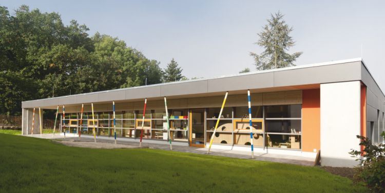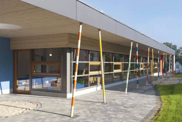 Neubau als eingeschossiger Massiv- bau in Mauerwerk - Abfangung auf der Rückseite mit Stahlbeton-Stütz- wand-Konstruktion Deckensysteme als vorgefertigte Brettstapeldecken Abstützung der Überdachung mit “tanzenden” Stahlrohrstützen |