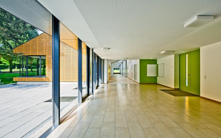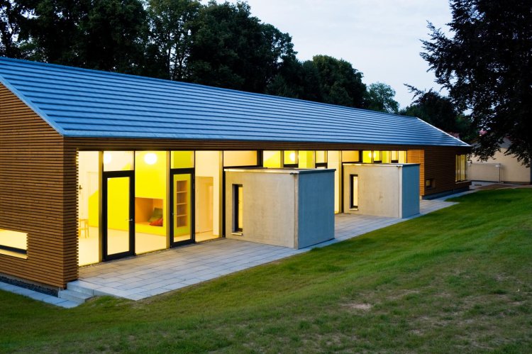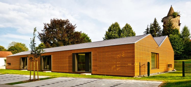 Eingeschossiger, zweigliedriger Massivbau mit Holz-/Stahl-Pfetten-Dach Vorgesetzte, hochwertige Holz-Lamellen-Konstruktion Umbauten in den Bestandsgebäuden | |