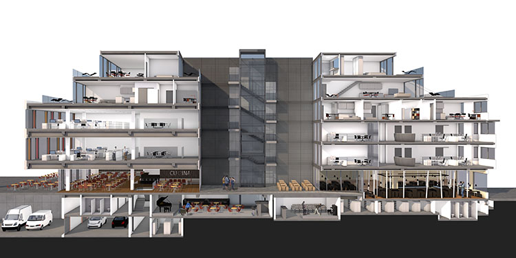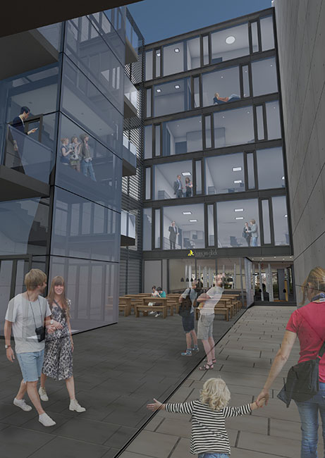 Zweigeschossige Aufstockung des Gebäudes Königsplatz 15 in Ortbeton-Skelettbauweise sowie umfangreicher Umbau durch Stahlabfangungen 7-geschossiger Wiederaufbau des Gebäudes Marienplatz 18 als Ortbeton-Skelettbau mit unterzugsfreien Decken Verbindungs-Spange als 5-geschossige Stahlbeton-Brandwand mit auskragenden Stahl-Konstruktionen und austeifender Stb.-Röhre als Fahrstuhlschacht | |
