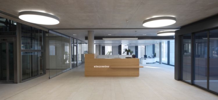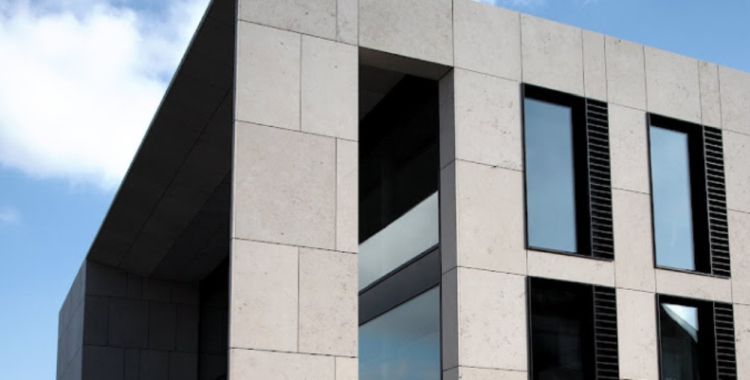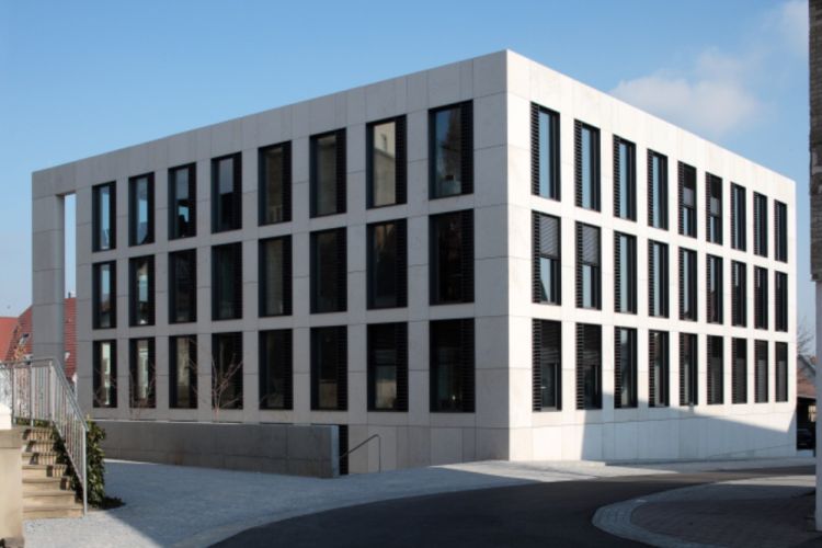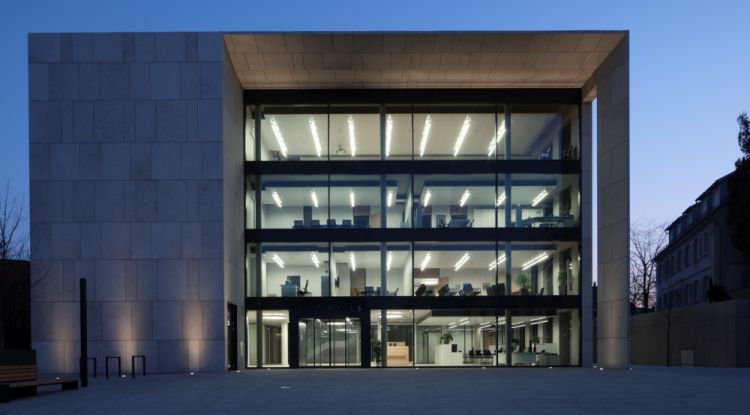 5-geschossiger Ortbeton-Skelett- bau mit vorgehängter Natur- steinfassade Sichtbetonflächen bis Klasse SB 4 Decken als unterzugsfreie punkt- gestützte Platten mit Betonkern- aktiverung Untergeschoss als wasserdichte Weisse Wanne |