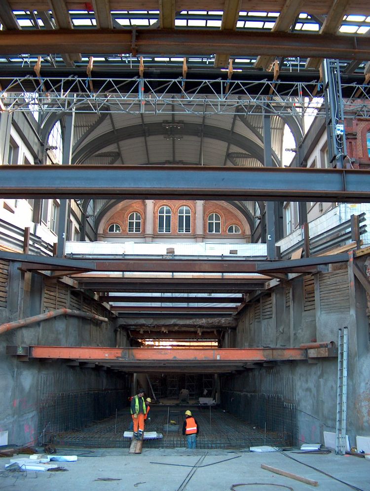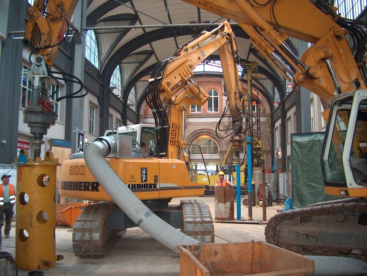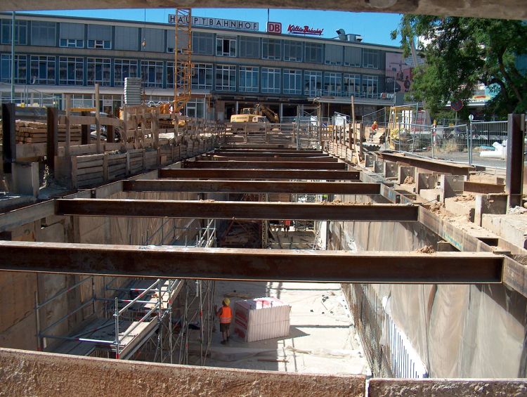 ca. 170 m langes Tunnelbauwerk in Offener Bauweise mit Haltestelle und Bogendach als räumlichen Holz- Trägerrost Abfangung der massiven Sandsteinpfeiler der Bahnhofshalle mit vorgepresster Stahlkonstruktion Ausführung der Baugrube in der Bahnhofs-Empfangshalle und Unterfangung mit rückverankerten HDI System | |