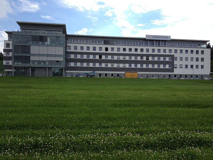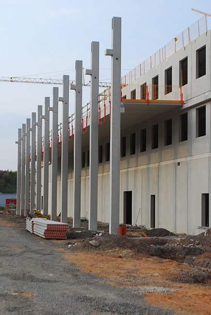 ca. 4.900 m² Büro - ca. 2.040 m² Produktion - ca. 880 m² Lager und Werkstatt Bürogebäude als 4-geschossiger Fertigteilbau mit unterzugsfreien Deckensystemen 15 m hohe Produktionshalle mit Leimholzbindern auf Fertigteil-Konstruktion und 2 Kranbahnen | |
