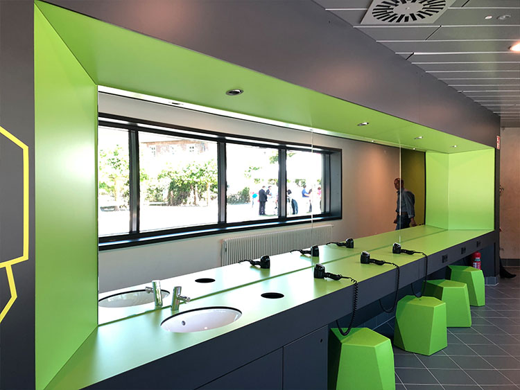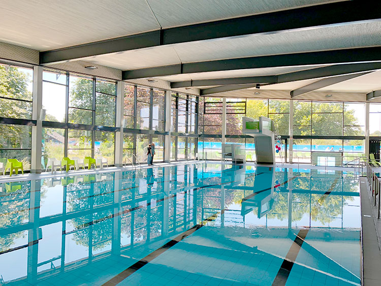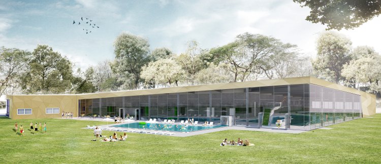 ca. 80 m langes und max. 30 m breites Schwimmbad-Gebäude in „Z“-Form Stahl-Trägerrost-Tragwerk über den Schwimmhallen mit tragenden ligno-trend-Akustik-Holzelementen Infra-Struktur-Bereiche und Gastro-Bereich in Ortbeton-Skelettbauweise Untergeschoss mit Schwimmbad-Technik als wasserdichte WU-Konstruktion | |
