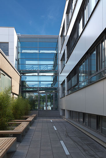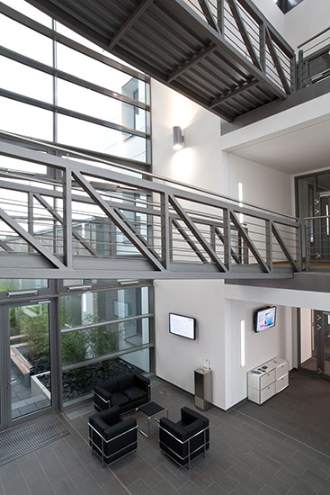 Aufstockung des vorhandenen Bürogebäudes mit freitragenden Stahl-Rahmenkonstruktionen Neubau des gebäudeverbindenden Foyers als Stahl-Glas-Konstruktion Zwei Verbindungsbrücken als freigespannte Fachwerkträger zwischen den Baukörpern Komplett-Umbau und –Umstrukturierung aller Bürogeschosse | |