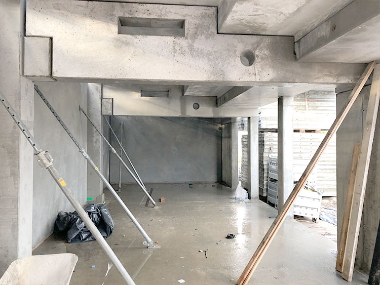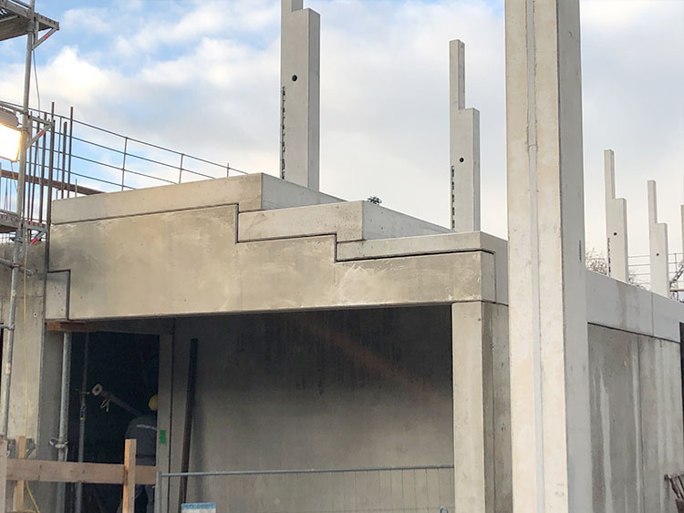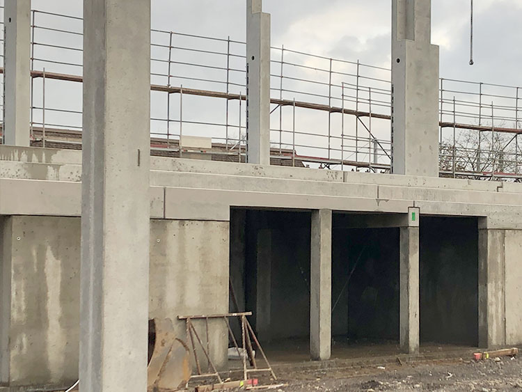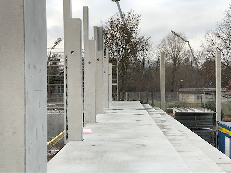 Neubau einer 3-Feld-Sporthalle in Stahlbeton – Ortbeton- bzw. –Fertigteil-Bauweise 32,50 m weit gespannte Spannbeton-Dachbinder auf eingespannten Fertigteil-Stützen Einspannung in die Fundamente mit Schraubsystem PEIKKO Zweigeschossiger Infra-Struktur-Baukörper mit Zuschauertribüne in Ortbeton Skelett-Bauweise | |