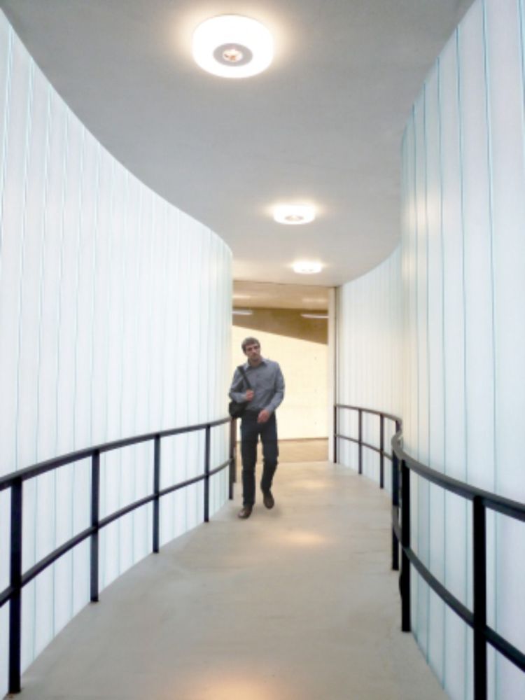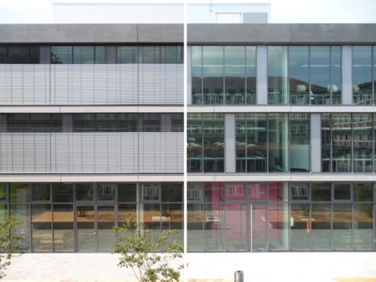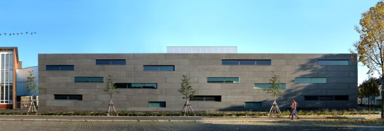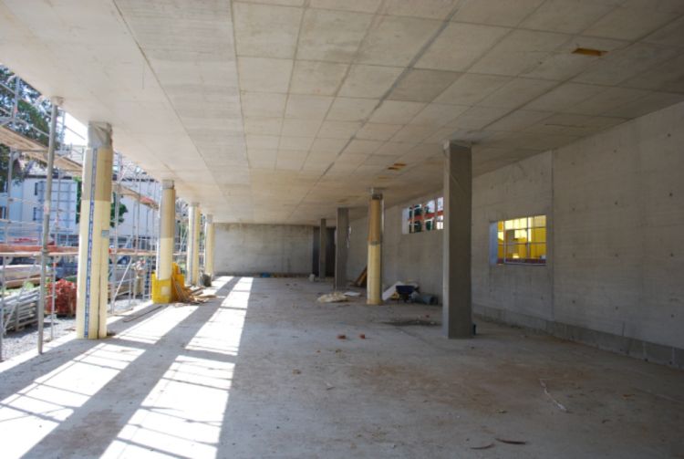 3-geschossiger Ortbeton-Skelett- bau mit vorgehängter und anthrazit eingefärbter Stahlbeton-Fertigteil- Fassade Sichtbetonflächen bis Klasse SB 4 Abtragung der oberen Gebäudelasten z.T. durch freitragende Stb.-Wand- scheiben | |