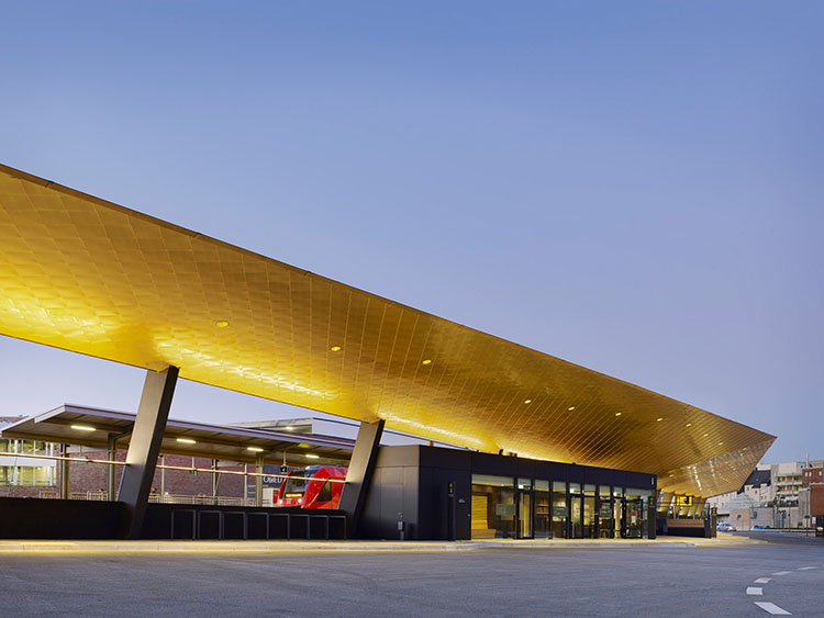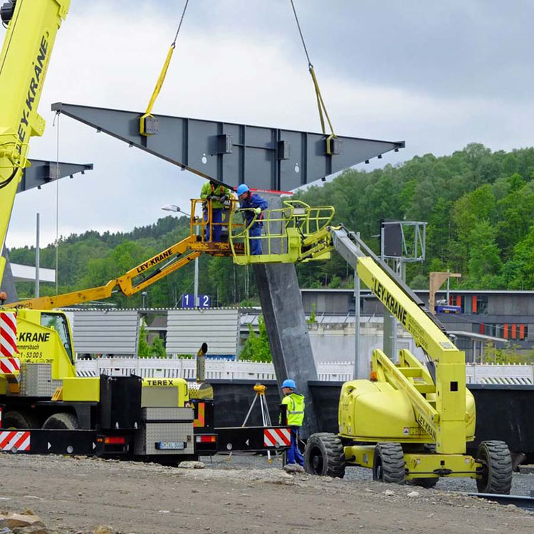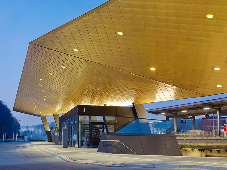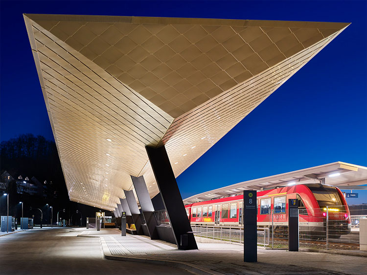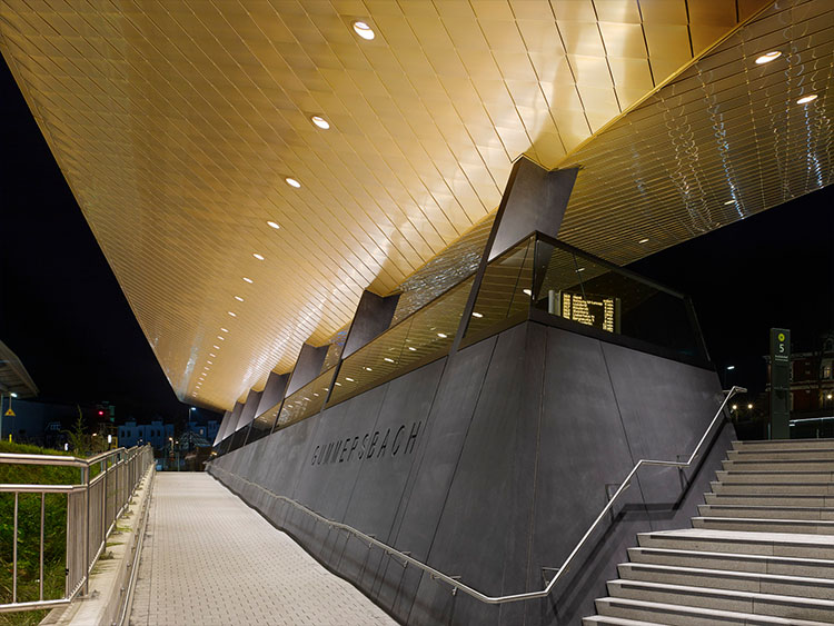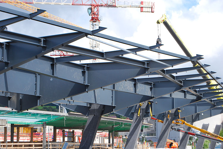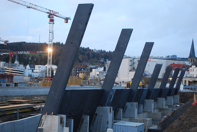 Ca. 120 m lange und 6-20m breite Dachkonstruktion als räumliches Stahl-Tragwerk mit unterseitiger Metall-Gewebeverkleidung auf 12 Fertigteil-Schrägpfeilern – in Fertigteil-/Ortbeton-Konstruktion der Bastion eingespannt | |